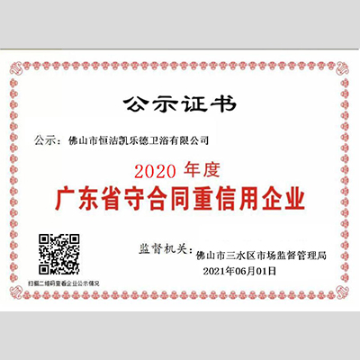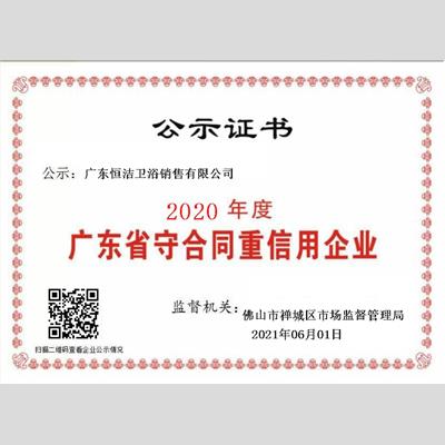 獎 項:2020年度廣東省“重合同守信用”企業 ——恒潔衛浴集團