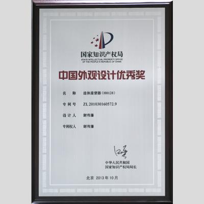 獎(jiǎng) 項(xiàng):中國(guó)外觀設(shè)計(jì)優(yōu)秀獎(jiǎng)--連體座便器H0128(專利號(hào) ZL201030160572.9 設(shè)計(jì)人:謝偉藩,專利權(quán)人:謝偉藩)