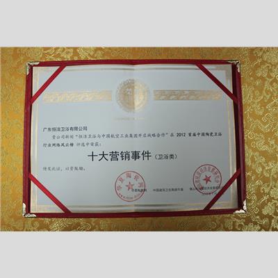 獎 項(xiàng):中國陶瓷衛(wèi)浴行業(yè)“十大營銷事件”(與中國航空工業(yè)集團(tuán)合作)