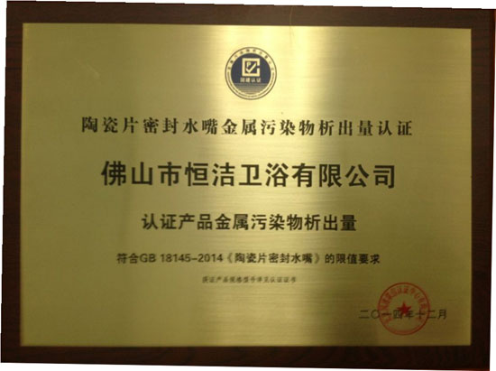 12月1日,水龍頭新國標GB18145-2014《陶瓷密封片水嘴標準》宣告正式施行,恒潔衛浴成為首批“陶瓷片密封水嘴金屬污染物析出限值認證”的企業,被授予認證牌匾,成為中國水龍頭新國標施行后首批通過認證檢測的品牌企業。