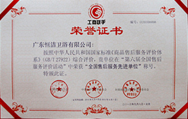 憑借“1350陽光服務體系”,恒潔衛浴被授予“全國售后服務先進單位”稱號。